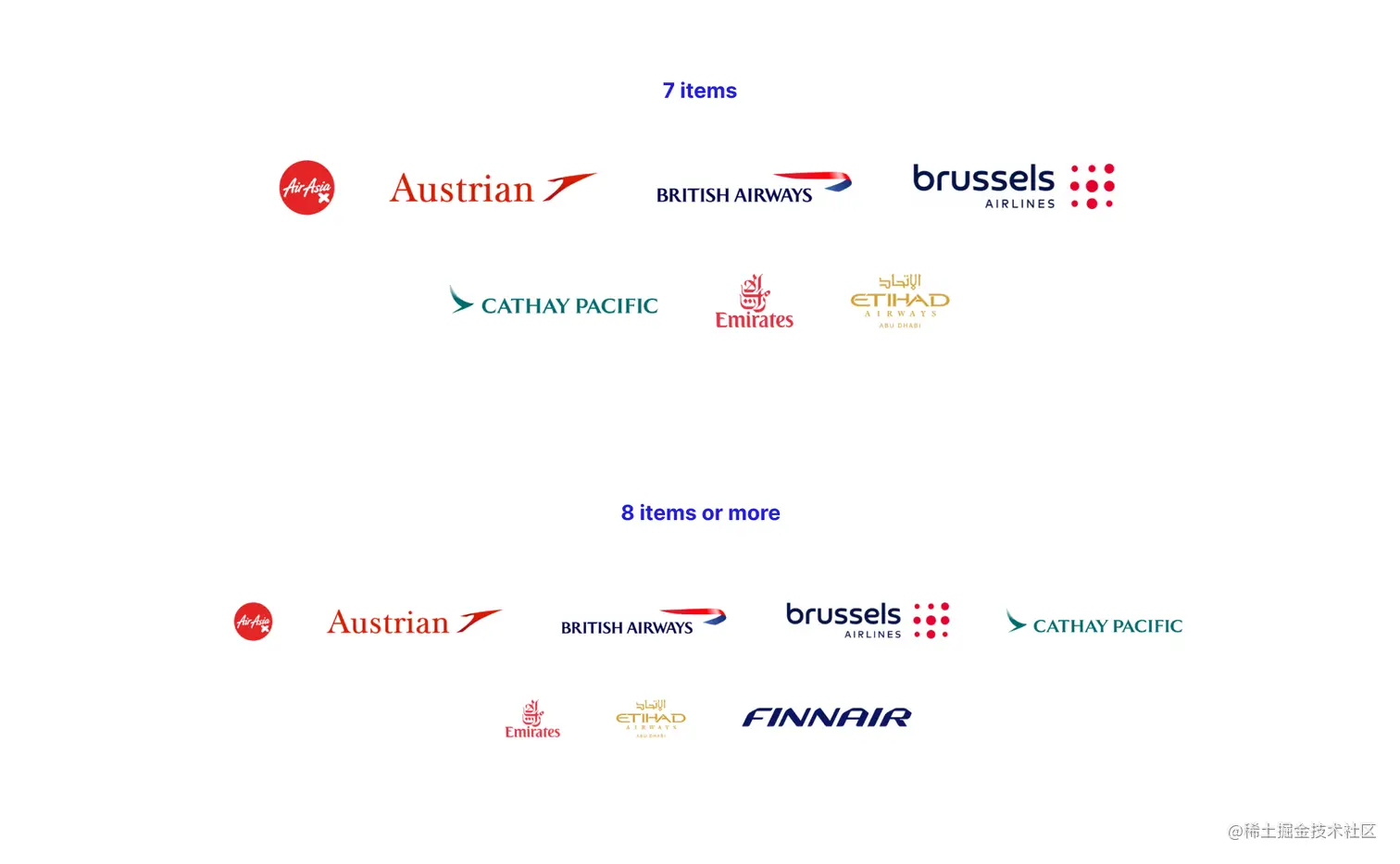 当有3个或更少的项时,间距是水平的,而当有5个或更多时,间距是垂直的。我们可以通过将页边距从水平方向翻转到垂直方向,或者通过使用CSS gap与Flexbox来手动管理。但是,在这种情况下,我们又不得不使用inline-flex。