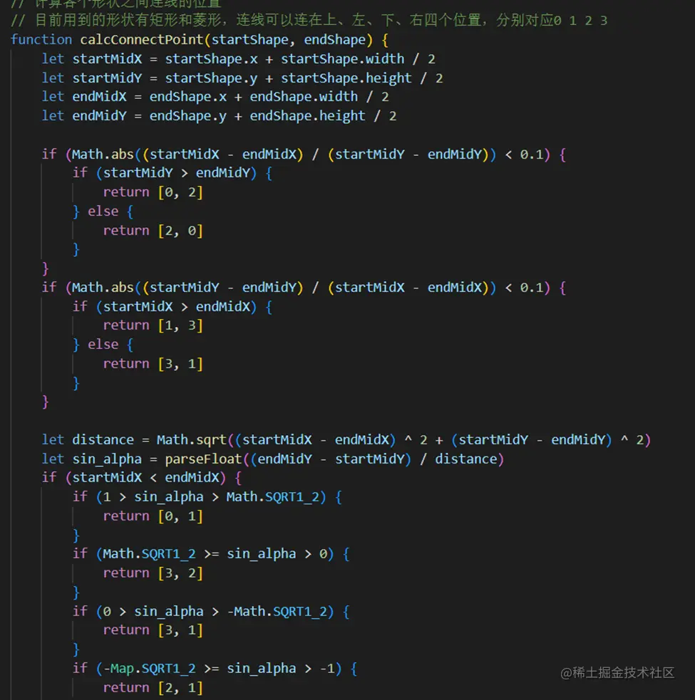 这里要用到一点初高中的数学知识,我们要计算从起始形状到目标形状中心位置的连线,与横轴夹角的正弦值来确定连接点: