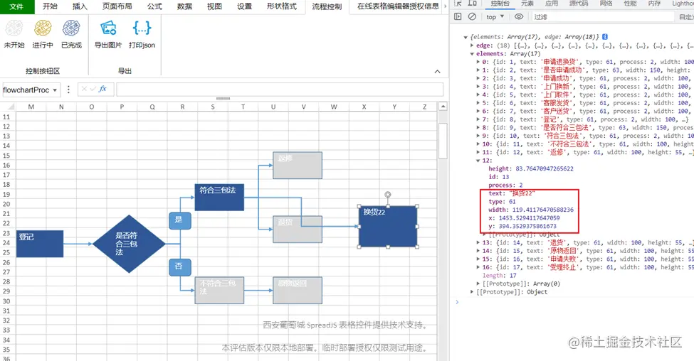 而SpreadJS(本公司产品,一款前端在线Excel表格)也支持插入流程图,但是有时候我们并不想自己去绘制流程图,而是希望根据某种数据结构自动生成一个流程图,而这个数据可以在服务端自动拼接好,也可以直接是其他三方服务的数据。将数据发送到前端后,自动生成一个流程图,如果对流程图做出一定的修改,数据也跟着变动,这样流程图的数据也可以保存下来,方便下次使用。