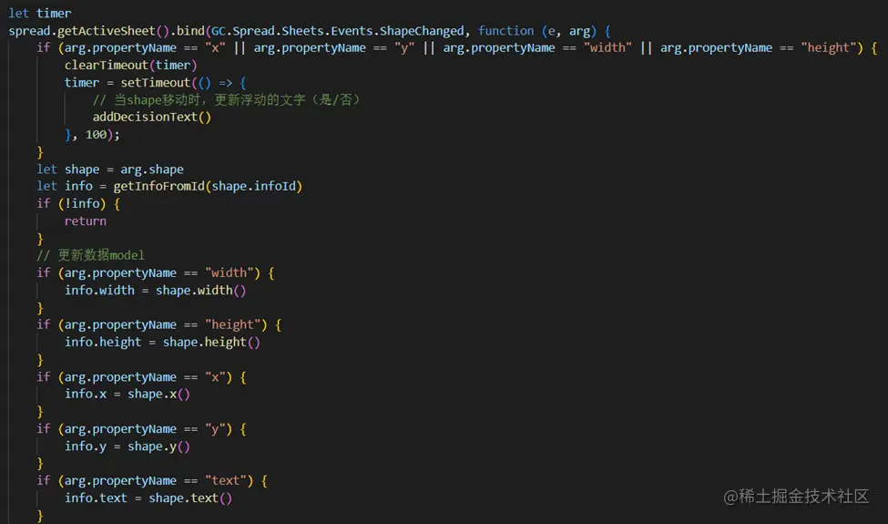 因为用户可以随时拖动流程图,而流程图的变化属性大致有以下几种:位置、长宽、文字属性,我们要将他们最新的值记录下来,方便下次还原。另外,当位置和长宽变化时,连线也会自动更新,我们需要更新上文提到的“是”和“否”的文字的位置,这里用到了防抖模式以提升性能。
