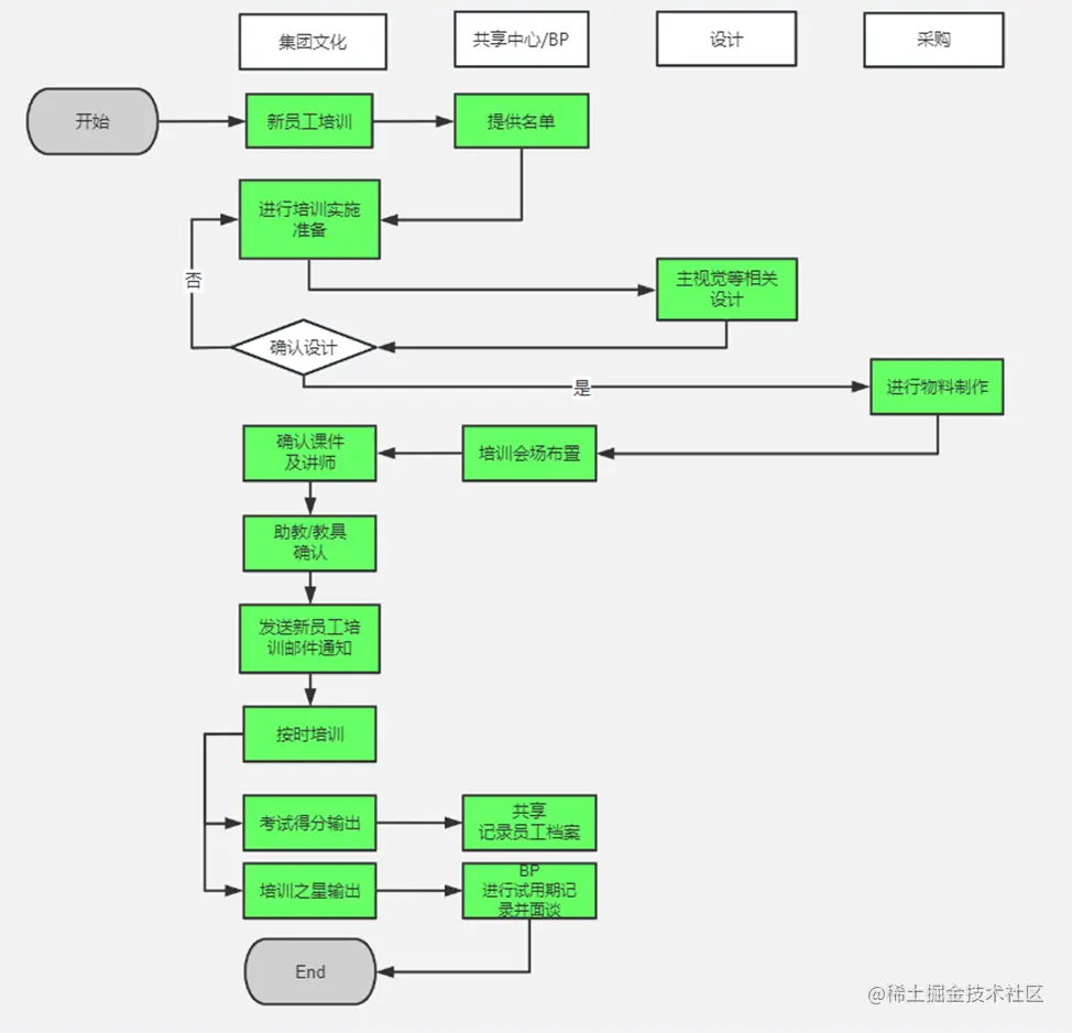 再例如在进行新员工培训时,可能有多个部门之间的协作,那么用流程图也可以很好地帮助员工了解后续的培训步骤: