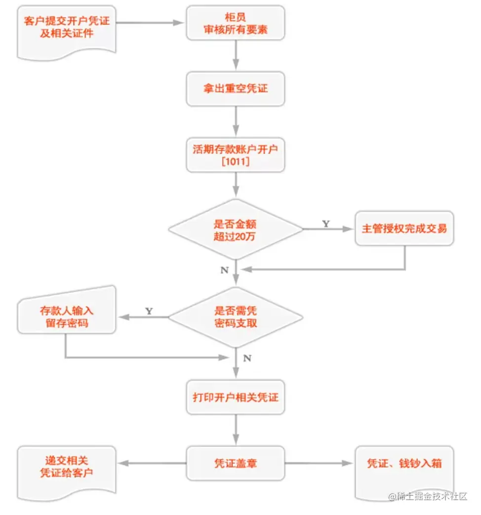 比如说,银行在办理开户业务时,会有一套较为复杂的流程,中间不仅有固定的步骤,如审核材料、打印凭证等,还会有一些判断条件,如金额是否超过20万、是否需凭密码支取等,这个时候可以通过一张流程图来清晰明了地展现整个业务流: