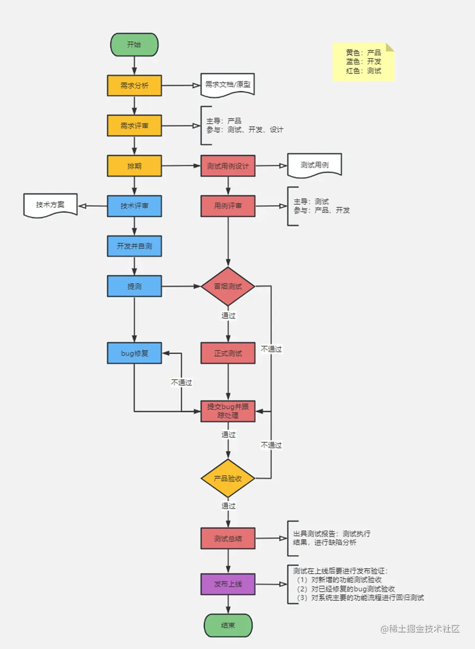 再举个例子,在互联网行业中,一个项目上线前需要进行完整的测试,测试分为很多类型,如黑盒、白盒、冒烟测试等,按照步骤进行,还要生成对应的测试报告。如果其中某一步测试不通过,需要通知研发修改bug,并重新测试,下面的流程图就可以非常清晰地展现研发、产品和测试相互合作的过程: