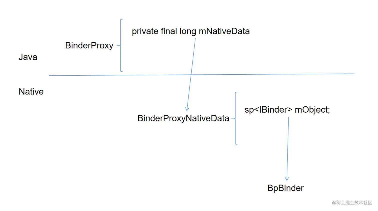从上文知道,ServiceManagerProxy 内部的 BinderProxy 是一个横跨 native 与 java 的数据: