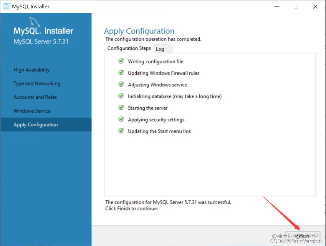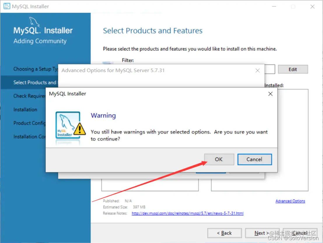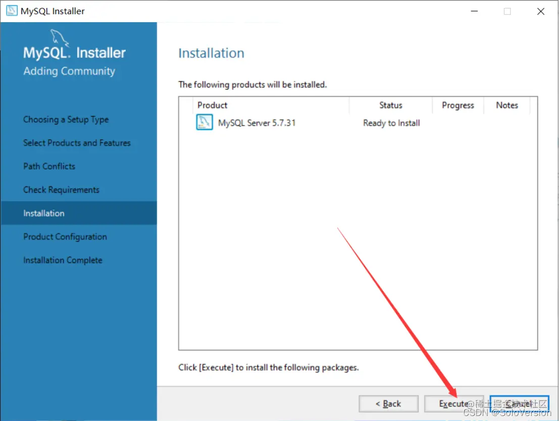 9. 先选中“MySQL Server5.7.31”,若电脑中没有这个环境,会提示安装“Microsoft Visual C++ 2013”环境,点击“Execute”