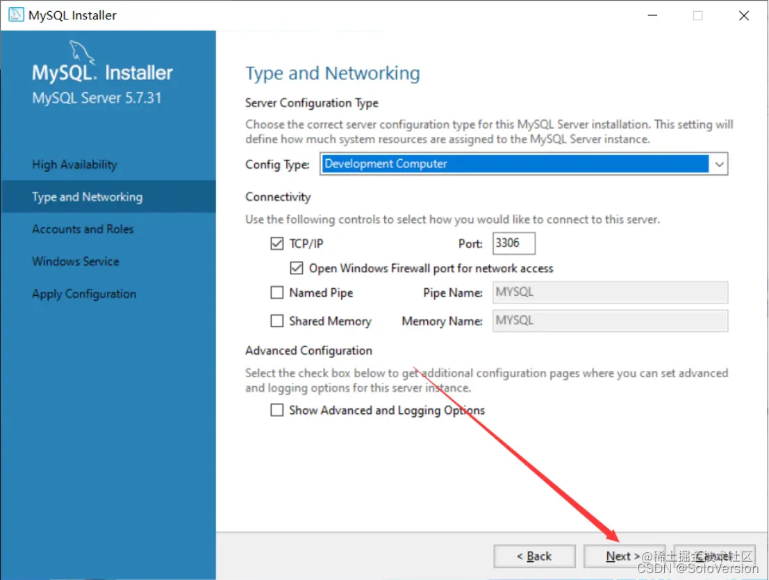 3. 先选中“MySQL Server 5.7.31” ,之后点击下方的蓝色“Advanced Options”