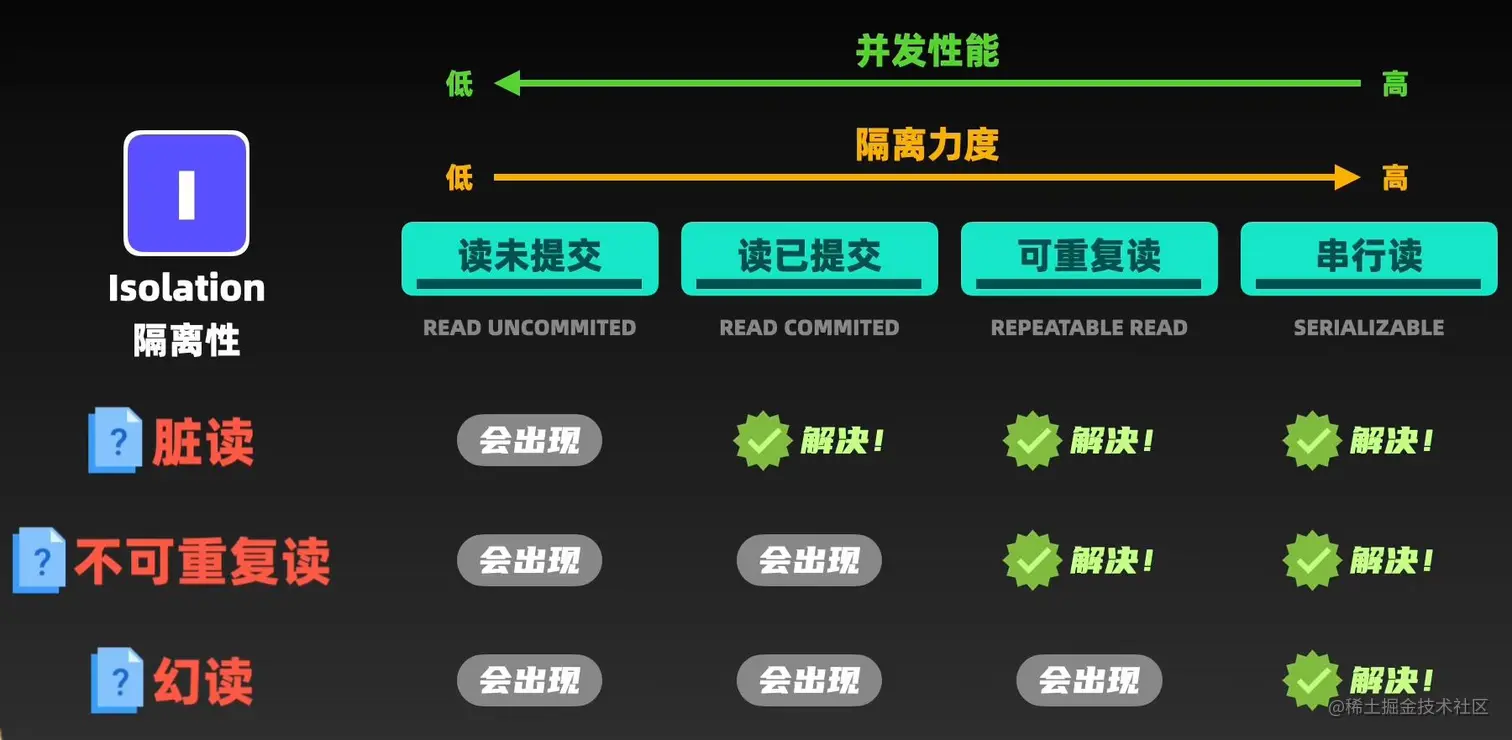 - 读未提交(Read Uncommitted):在该隔离级别下,一个事务可以读取到其他事务尚未提交的数据,即==脏读。还有不可重复读、幻读问题==。这是最低级别的隔离级别,它提供了==最高的并发性==,但也带来了最大的数据不一致性风险。
