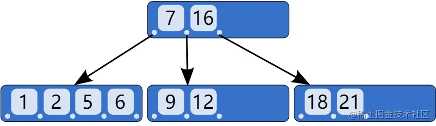 B+ 树是一种多叉排序树,即每个节点通常有多个孩子。一棵 B+ 树包含根节点、内部节点和叶子节点。根节点可能是一个叶子节点,也可能是一个包含两个或两个以上孩子节点的节点。