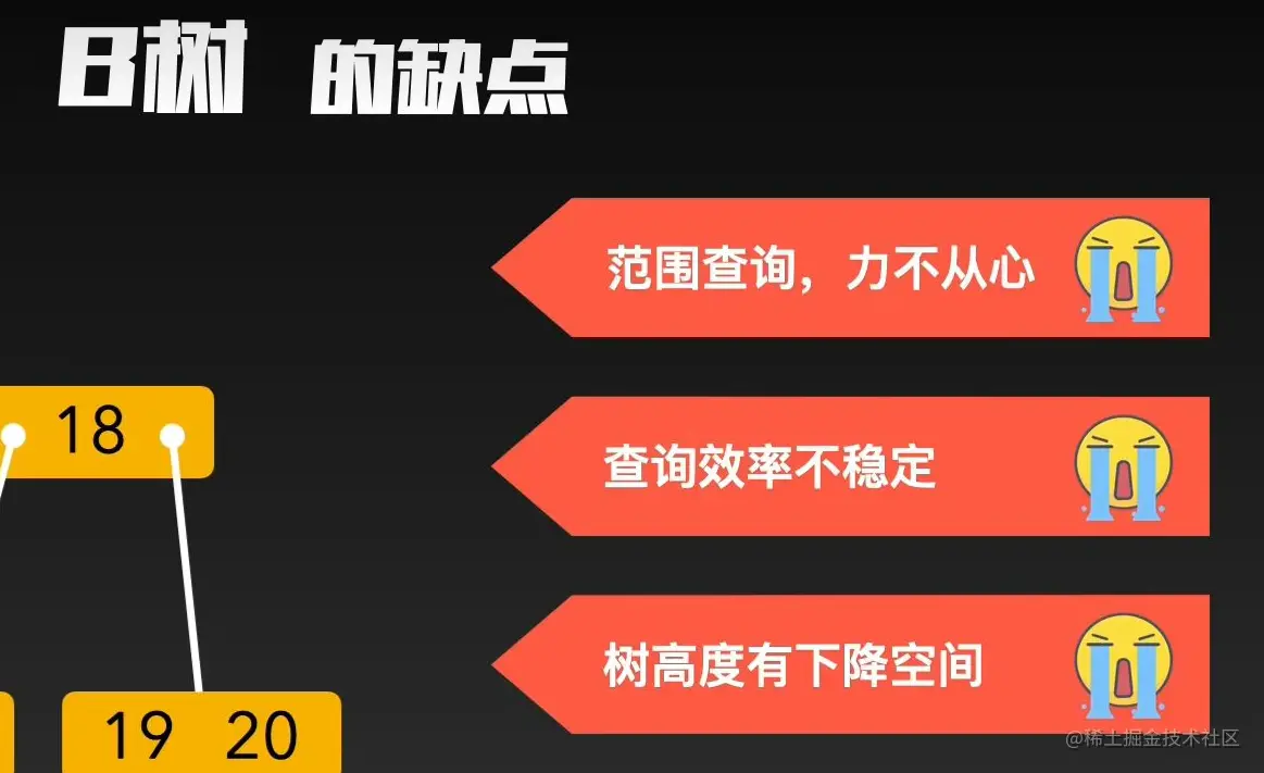 - 由于索引节点上只有索引而没有数据,所以==索引节点上能存储比 B 树更多的索引==,这样树的高度就会更矮。树的高度越矮,磁盘寻道的次数就会越少。
