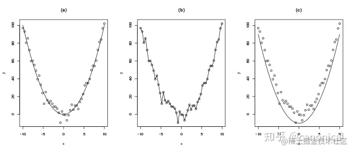 我们所建立的模型只能是类似图(a)中的简单曲线,图(b)中的模型试图精确拟合每一个数据点在数学上称之为过拟合,它难以描述新的数据,而图(c)中限制差量只能为正值则会极大的限制模型的描述精度。