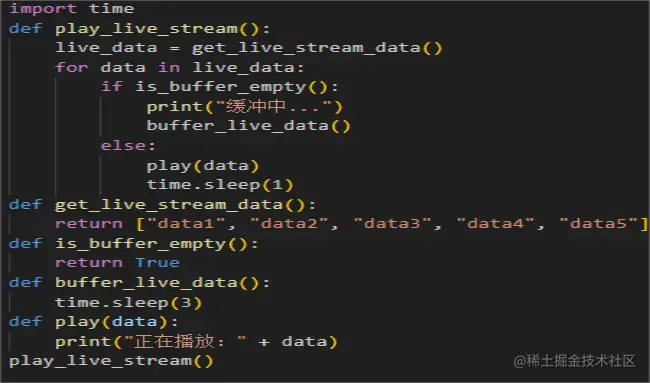 import timedef play_live_stream(): live_data = get_live_stream_data() for data in live_data: if is_buffer_empty(): print("缓冲中...") buffer_live_data() else: play(data) time.sleep(1)def get_live_stream_data(): return ["data1", "data2", "data3", "data4", "data5"]def is_buffer_empty(): return Truedef buffer_live_data(): time.sleep(3) def play(data): print("正在播放:" + data)play_live_stream()