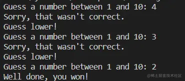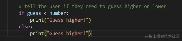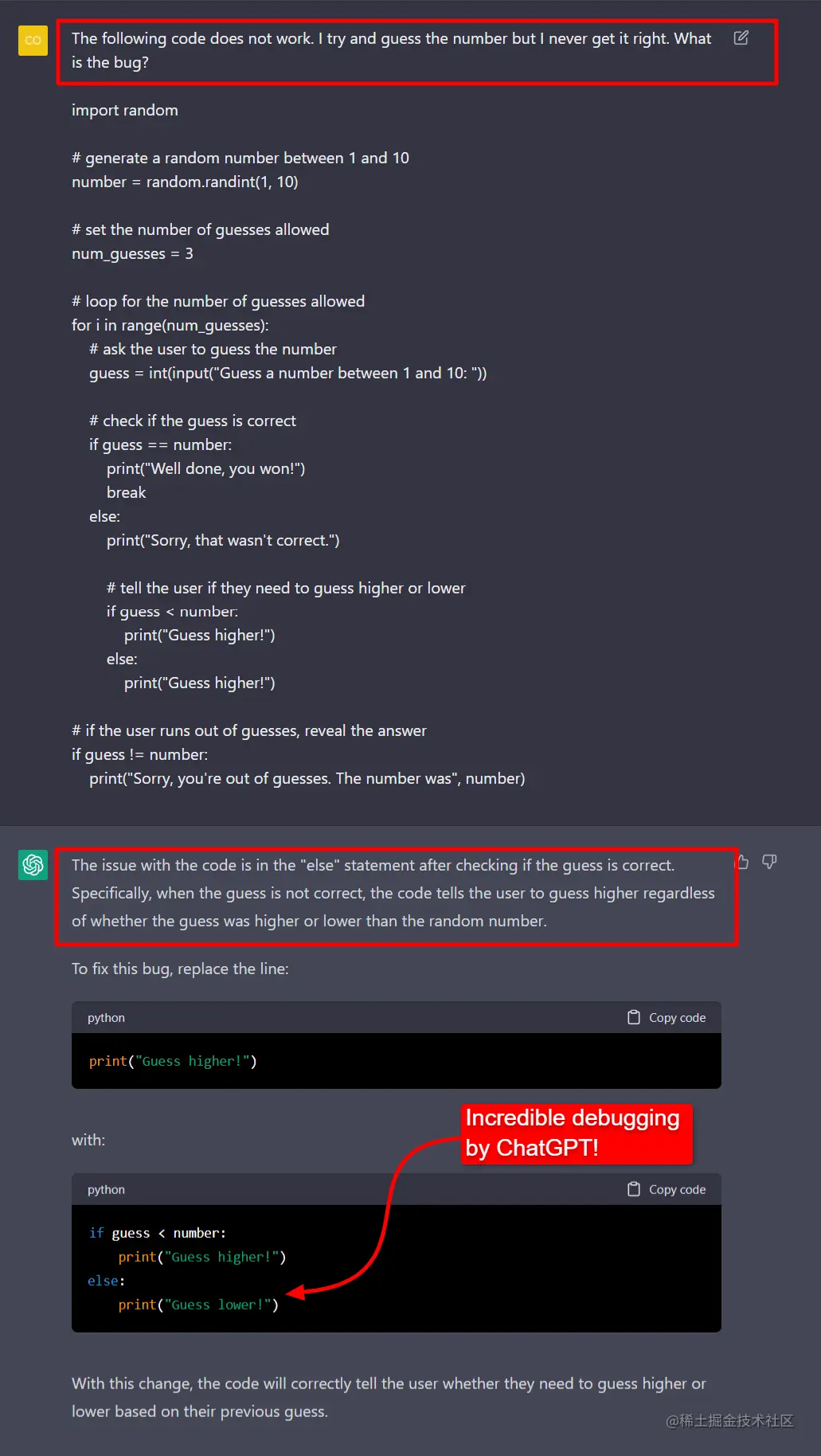ChatGPT 还可以用于查找错误。我们修改了上面的代码,添加了一个很难发现的错误:程序员向用户输入了错误的消息,告诉用户猜测更高而不是更低。发现这些类型的错误通常是一场噩梦。让我们看看ChatGPT是如何管理的:
