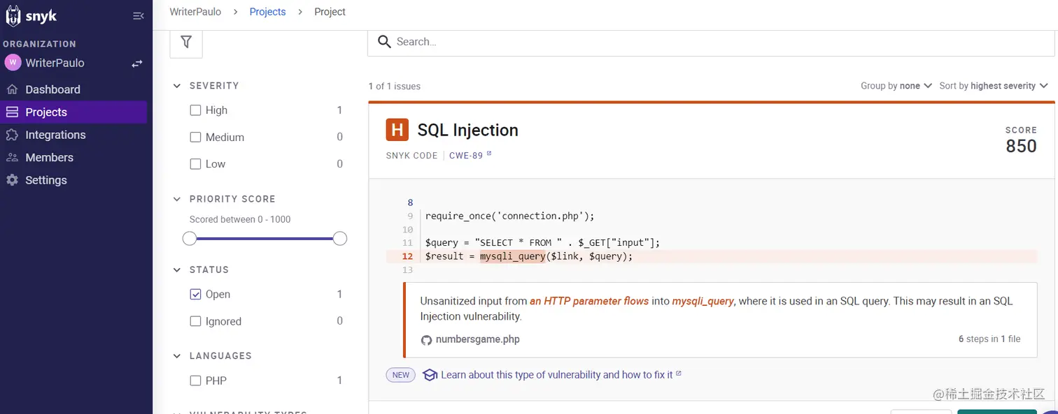 Snyk 在我们发送的代码中没有检测到任何漏洞,因此我们添加了一些 非常糟糕的 PHP 编程。Snyk 在将文件添加到存储库后立即对其进行了标记。