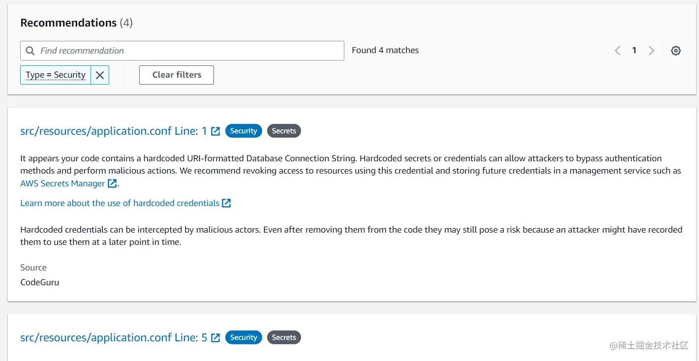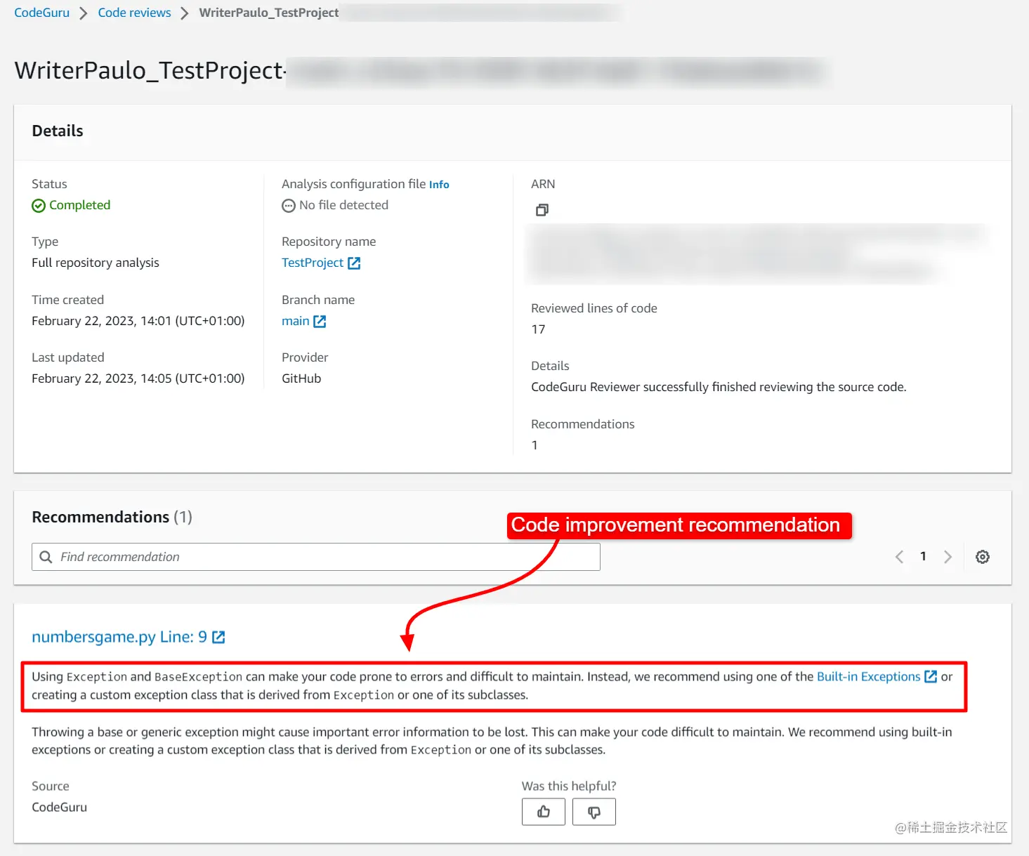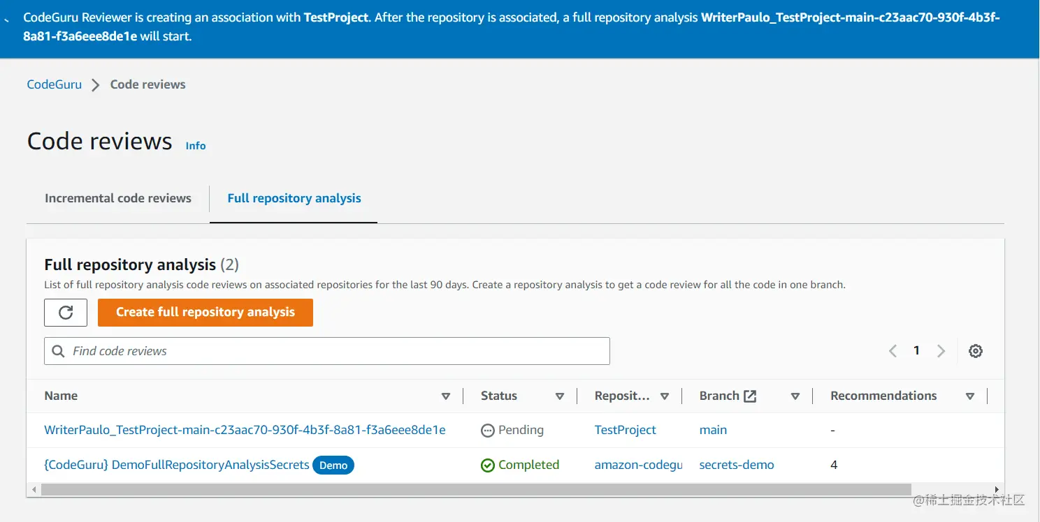 我们对测试项目存储库进行了分析,CodeGuru 提供了改进建议。您还可以对特定分支(项目的独立副本)运行CodeReview。