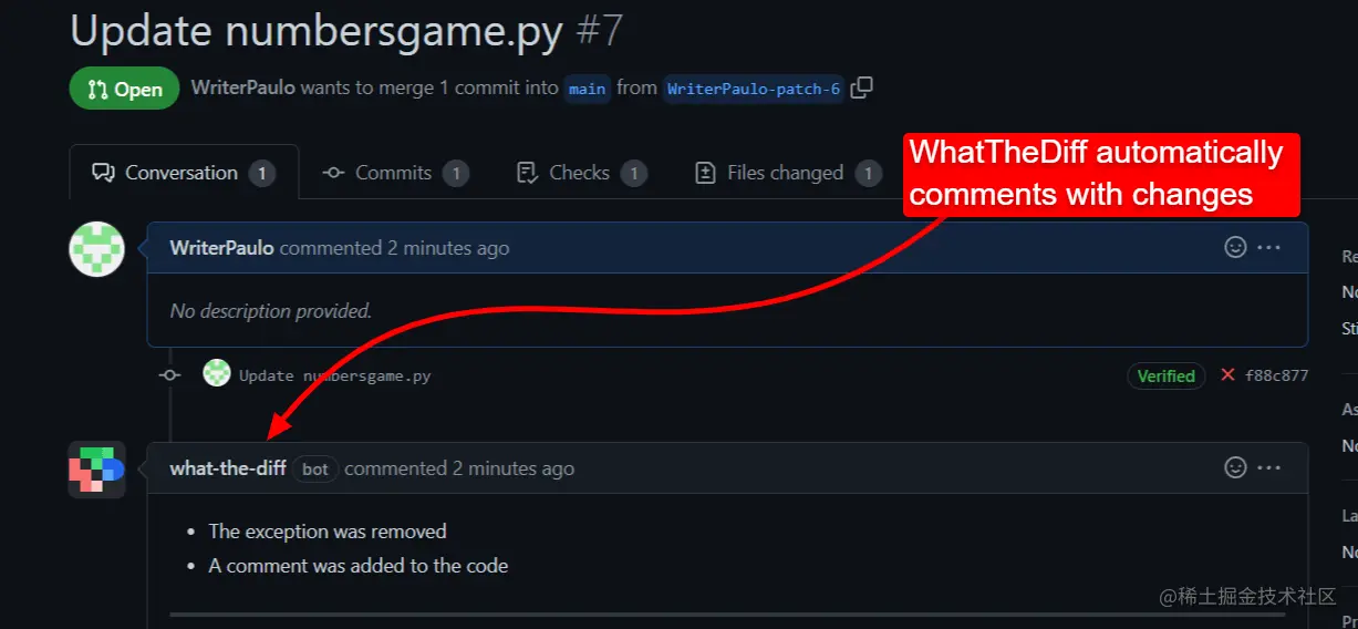 WhatTheDiff 自动检测更改,然后在 GitHub 拉取请求中对它们进行评论。
