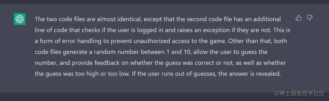 我们要求 ChatGPT 比较两个代码文件,不幸的是,答案有点太罗嗦了。这是因为 ChatGPT 并不是专门针对编码任务进行训练的,而是针对人类语言生成进行训练的。