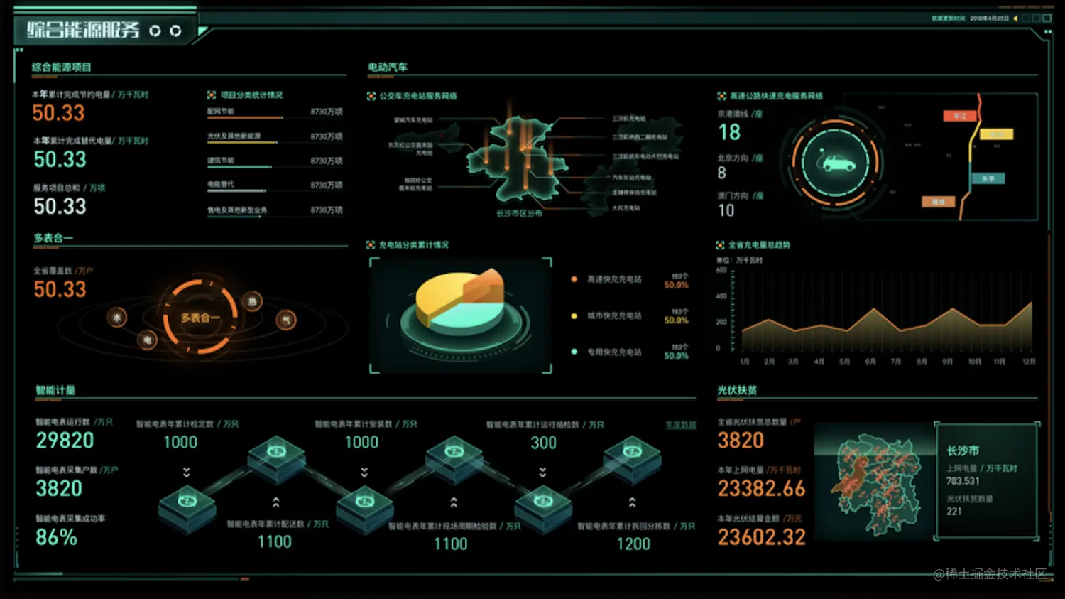 ●电动汽车:公交车充电站服务网格、高速公路快充服务网格、充电站分类、全年充电量趋势信息,呈现为电动汽车提供的服务内容