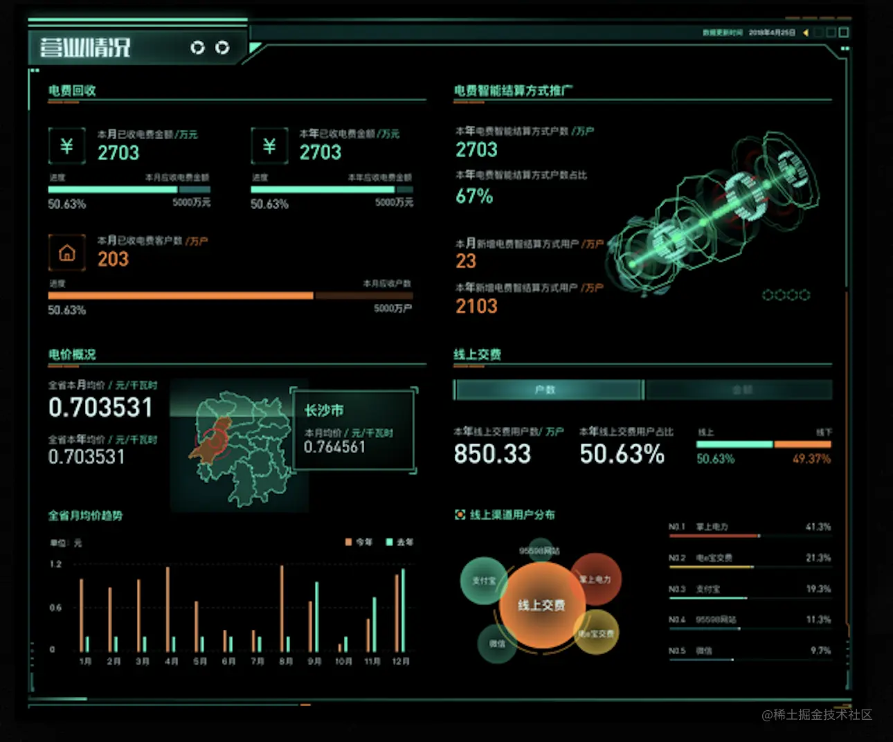 总体呈现电费、电价、缴费的营业数据,展示