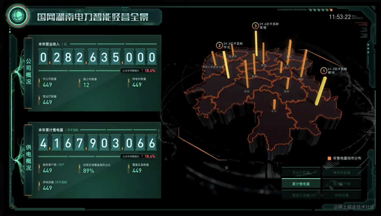 ●供电概况:展示供电概览信息,如本年累计售电量、供电容量、覆盖区县等