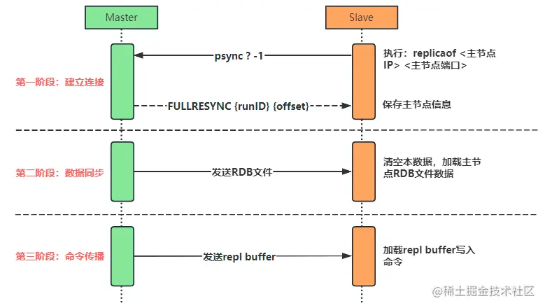 主从复制过程大致可分为3个阶段:建立连接阶段、数据同步阶段、命令传播阶段。