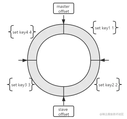 写入命令除了写入repl buffer,还会写入repl backlog(复制积压缓冲区),默认大小为1M,在内存中为环形结构。主要用于根据offset找到增量数据。结构如下图: