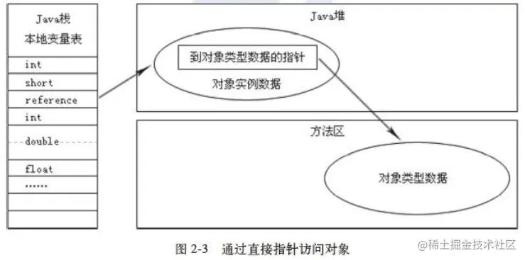 如果使用的是直接指针访问方式,Java 堆对象的布局中就必须考虑如何放置访问类型数据的相关信息, reference中直接存储的就是对象地址 ,如下