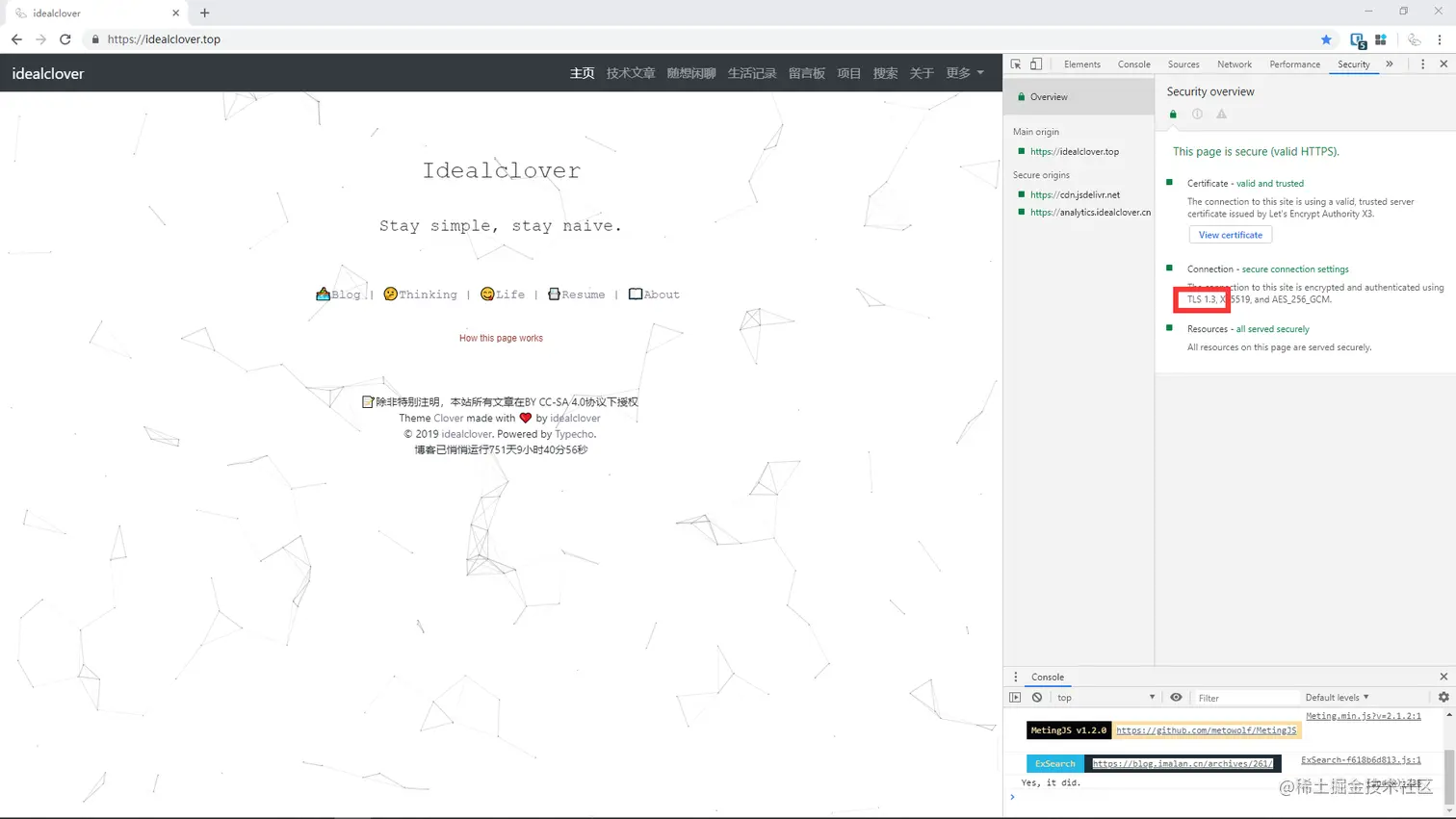 可以使用 chrome 浏览器对是否进行了 TLS 1.3 连接进行验证。 进入自己的网站之后按 F12 打开调试控制台,在右上的选项中找到 安全/security 选项卡,之后便能查看浏览器与服务器间的 ssl 协议类型,如果是 TLS 1.3 的话,就可以撒花啦!
