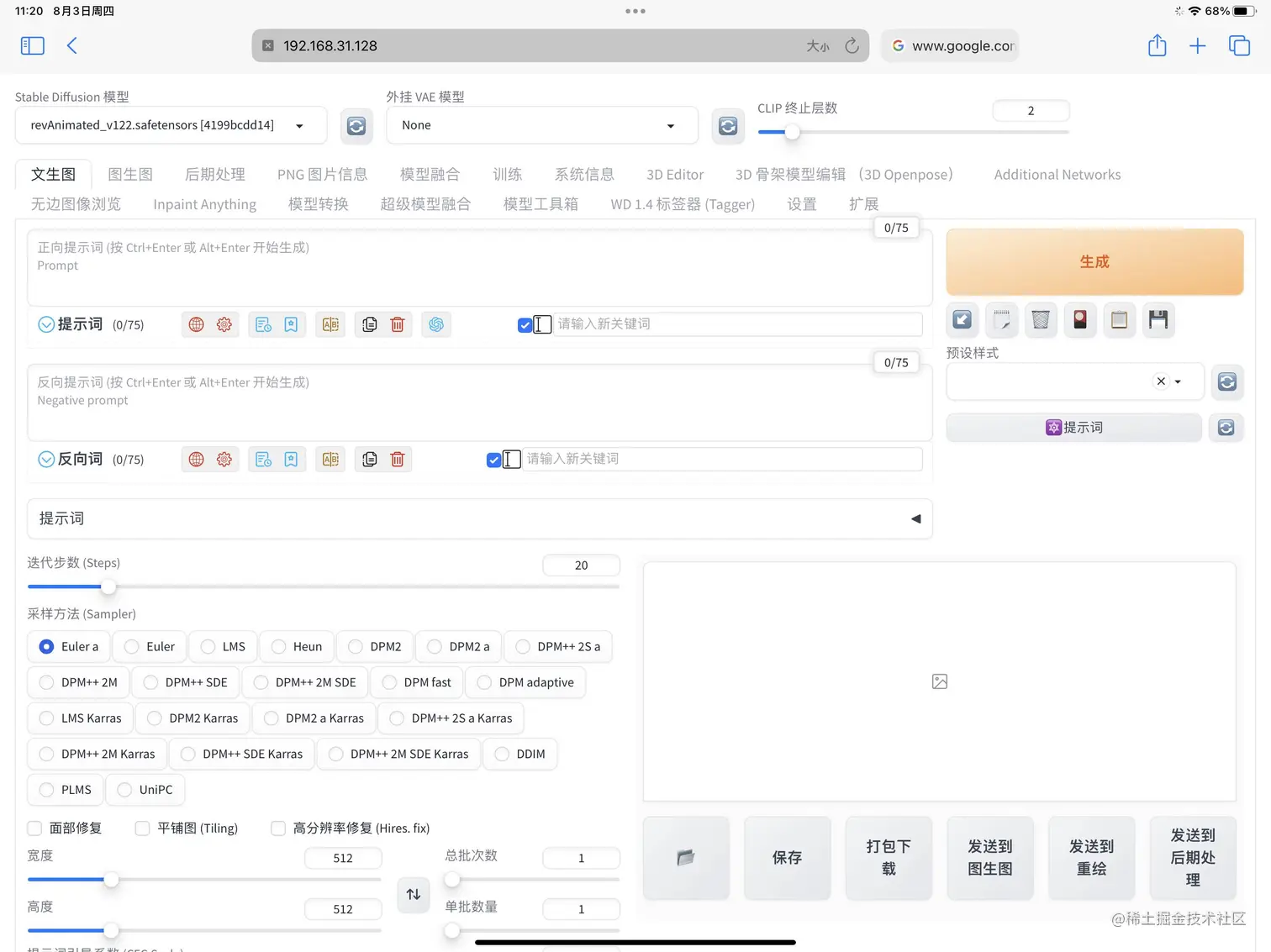 例如,我的服务机(即部署了SD的电脑)的地址是192.168.31.128,而我在秋叶中的端口号是7860,那么我在另一台设备上要输入的地址就是:192.168.31.128:7860(注意要用英文冒号) 两台设备要处于同一局域网下!!