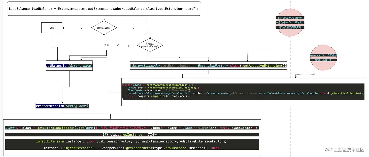 dubbo spi的原理和jdk的实现稍有不同,大概流程如下图,具体的实现读者可以自己了解下源码。