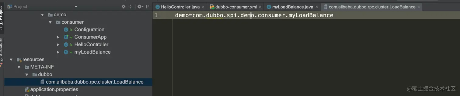 1 <dubbo:reference id="helloService" interface="com.dubbo.spi.demo.api.IHelloService" loadbalance="demo" />