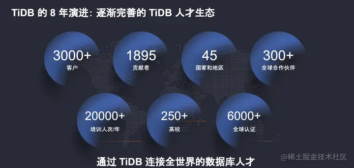 8 年以来,公司、产品不断壮大,TiDB 的人才生态也在逐步完善,现在也有了一些成果。我们通过 TiDB 成功地连接了全世界的数据库人才,TiDB 在全球有近 2000 名贡献者,遍布 45 个国家和地区,包括现场的同学也有很多 TiDB 的贡献者,TiDB 也成功进入了全球范围内超过 250 家高校。