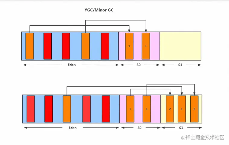4.如果再次触发垃圾回收,此时上次幸存下来的放在幸存者0区的,如果没有回收,就会放到幸存者1区