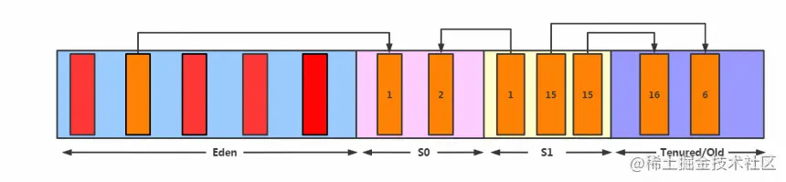 6.如果累计次数到达默认的15次,这会进入养老区。 可以通过设置参数,调整阈值 -XX:MaxTenuringThreshold=N