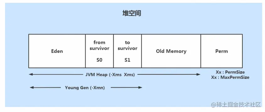 从图中可以看出: 堆大小 = 新生代 + 老年代。其中,堆的大小可以通过参数 –Xms、-Xmx 来指定。