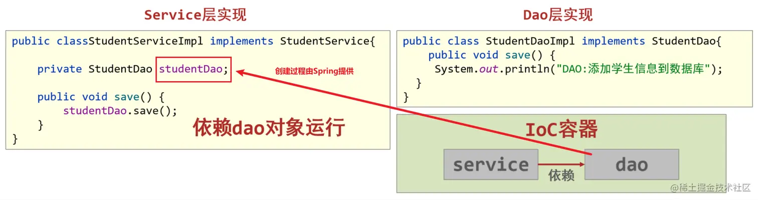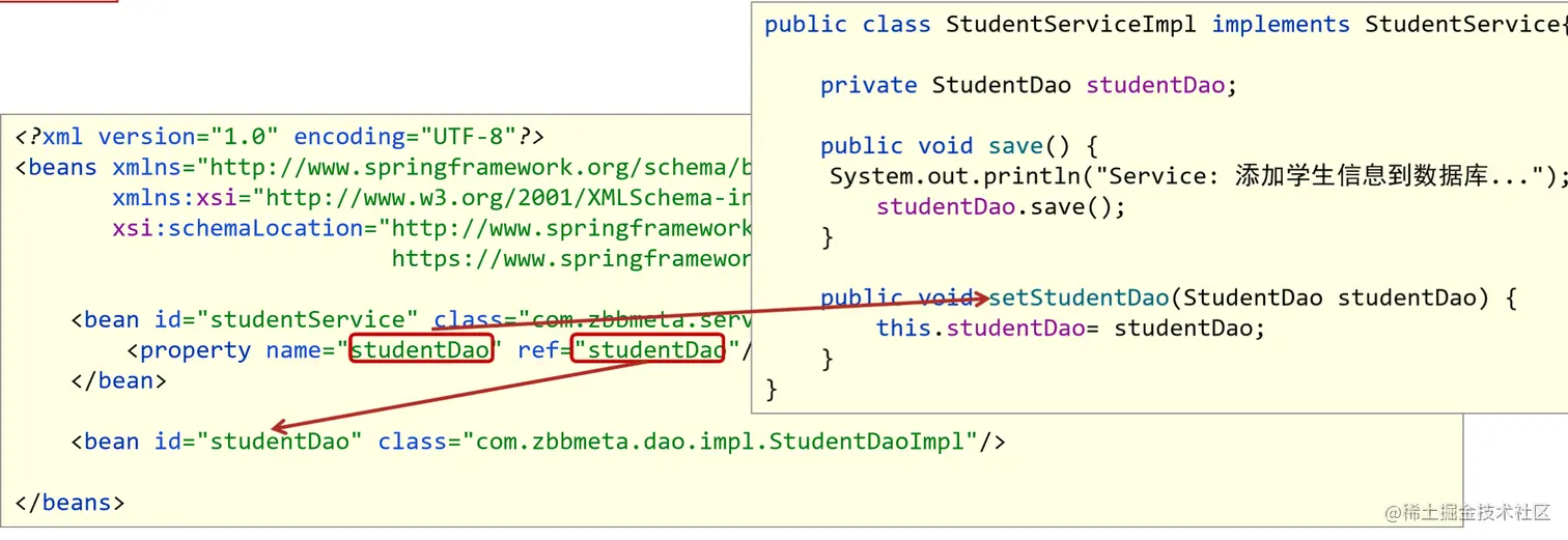 <!--3.给StudentServiceImpl对象里面studentDao成员赋值(DI 依赖注入)