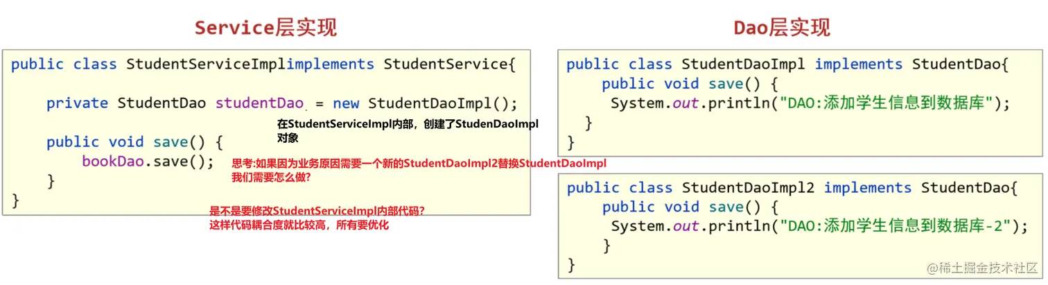 从上图思考问题:如果因为业务需要StudentServiceImpl,需要一个新的StudentDao实现 StudentDaoImpl2,name我们就需要在StudentServiceImpl中修改代码,也就是修改