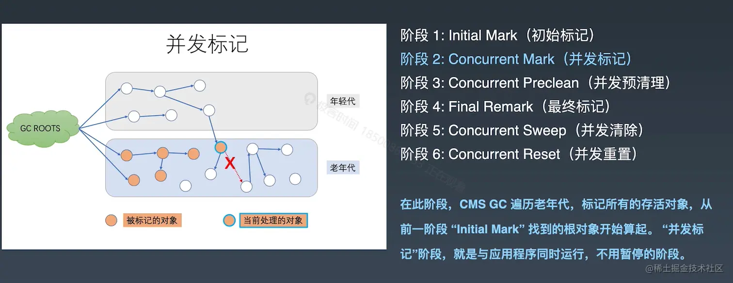 - 初始标记阶段是CMS GC的第一阶段,主要目标是标记GC Roots能够直接关联(通过引用链)的对象。