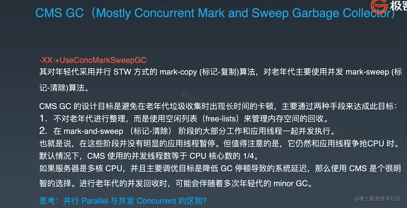 其对年轻代采用并行 STW 方式的 mark-copy(标记-复制)算法,对老年代主要使用并发 mark-sweep(标记-清除)算法。