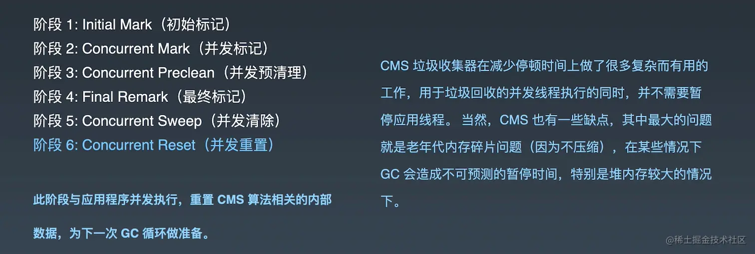 - 当重置完成后,CMS GC进入休眠,等待下一次触发条件出现。
