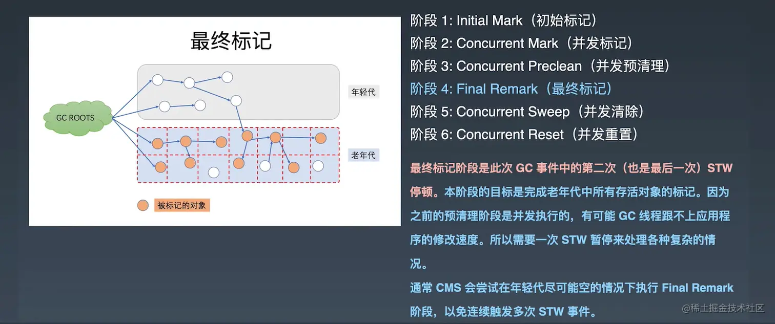 通常 CMS 会尝试在年轻代尽可能空的情况下执行 Final Remark阶段,以免连续触发多次 STW 事件。