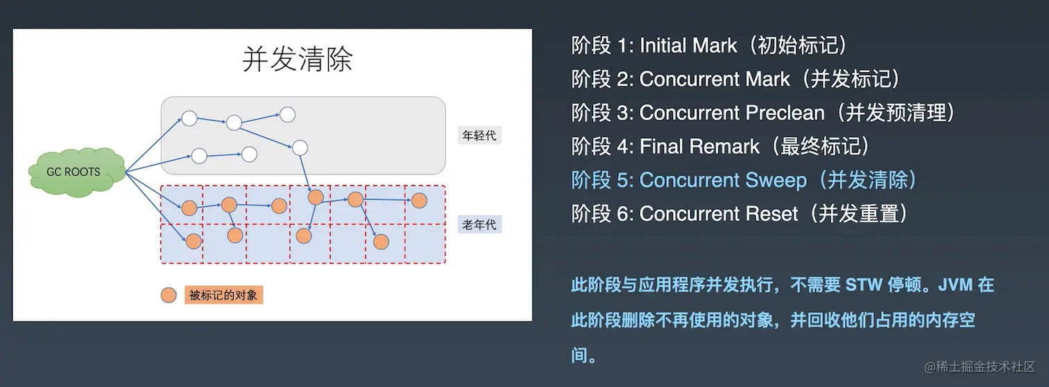 总结:此阶段与应用程序并发执行,不需要 STW 停顿。JVM 在此阶段删除不再使用的对象,并回收他们占用的内存空间