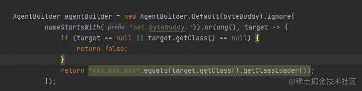 方案二: ByteBuddy也可以通过定义匹配器Ignored的方式取消对于某些类进行增强前的类型扫描。Ignored支持对于指定类加载器加载的类进行匹配。因此在使用多字节码框架时,可以通过配置需要取消扫描的类的类加载器信息,减少进行增强前需要扫描的类,进而减少服务启动时间。