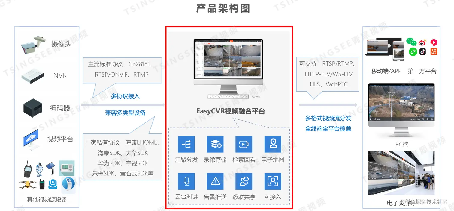 TSINGSEE青犀视频监控管理平台EasyCVR能在复杂的网络环境中,将分散的各类视频资源进行统一汇聚、整合、集中管理,实现视频资源的鉴权管理、按需调阅、全网分发、智能分析等,平台融合性强、开放度高、部署轻快,在智慧工地、智慧园区、智慧工厂、智慧码头、智慧水利等场景中有着广泛的应用前景。感兴趣的用户可以前往演示平台进行体验或部署测试。