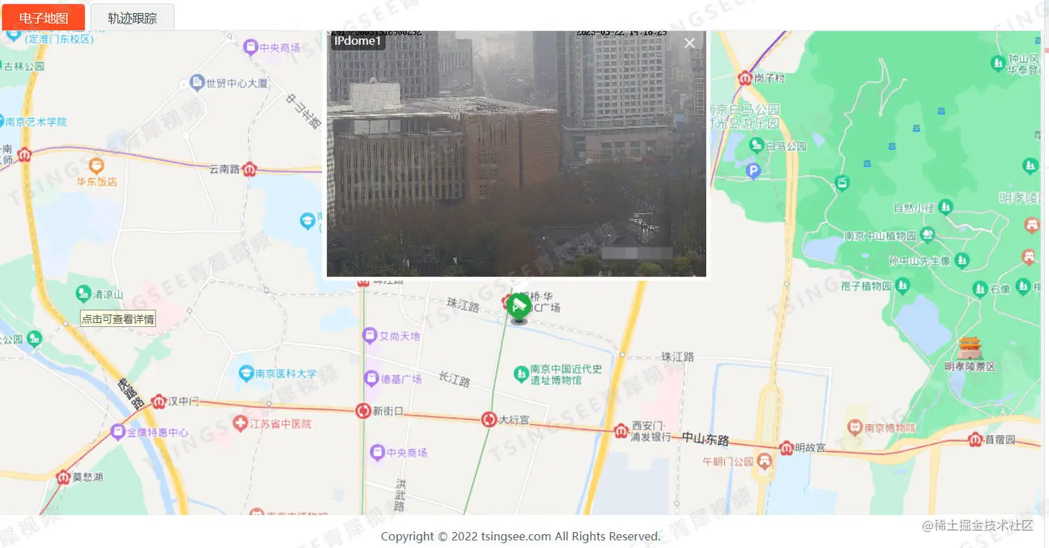 安防监控EasyCVR视频汇聚平台的电子地图功能,可将前端接入的设备(摄像头、车载监控、移动单兵、执法仪等)在GIS电子地图上实时显示,并且支持点击图标就能观看当前设备的实时视频监控,还可支持绘制历史行驶轨迹、历史轨迹回放等。