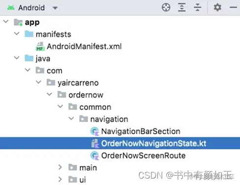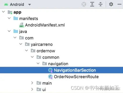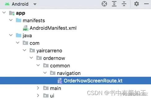 首先,创建一个名为common -> navigation的新遍历目录。在这个包中,我们像这样添加了一个名为OrderNowScreenRoute的类: