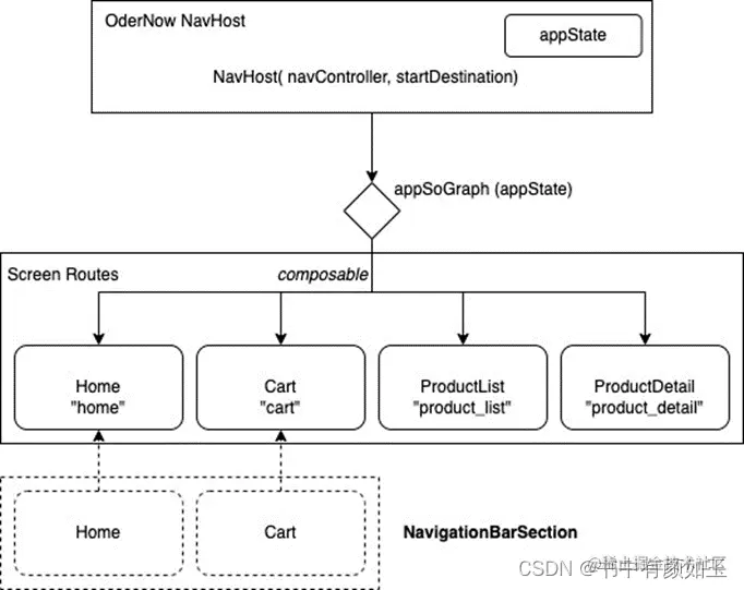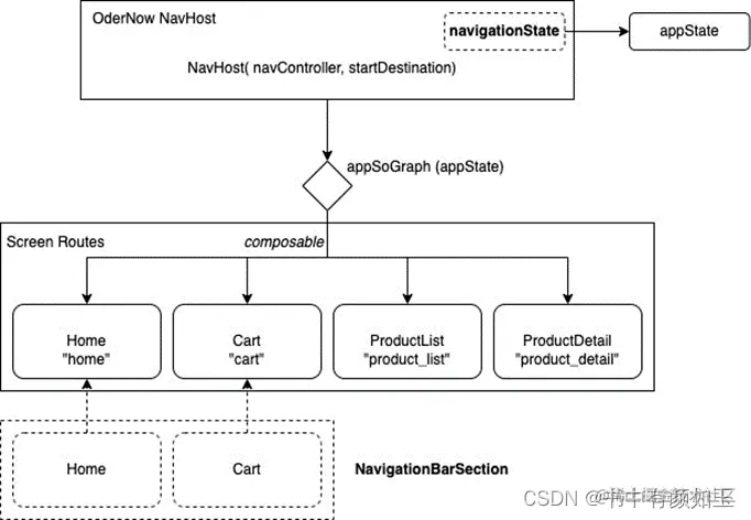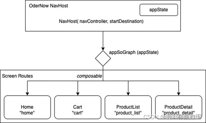 代码的重要部分是“Go to —> ProductList Screen”按钮的动作 onClick = goToProductList 的定义,其中通过设计原理章节中解释的状态提升技术,我们将动作 goToProductList 委托给在 OrderNowNavHost 中定义的 appSoGraph 导航图如下: