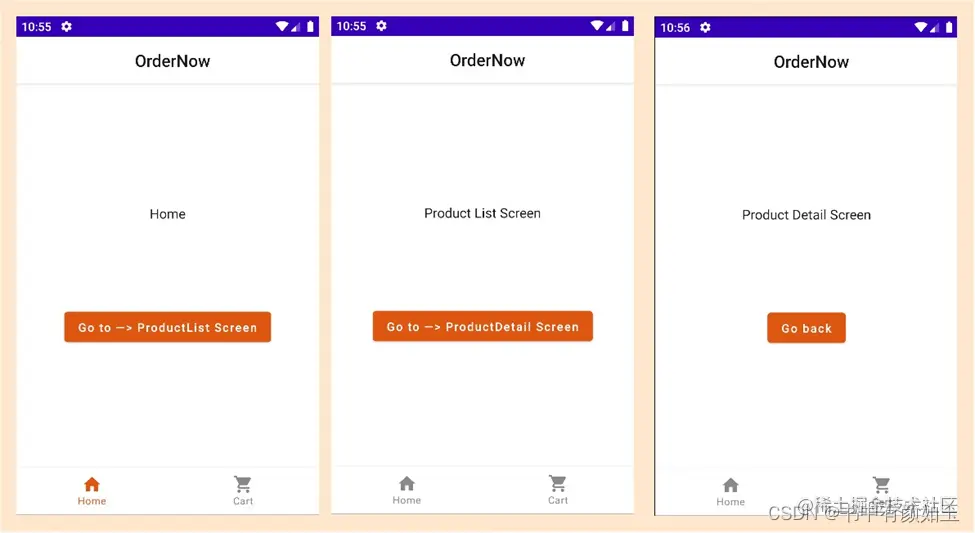 回想一下,navigatesave函数是OrderNowNavigationState结构中定义的扩展的一部分。同样的实现应用于导航到其他ProductList和ProductDetail屏幕,这样在OrderNowNavHost中的性能如下所示: