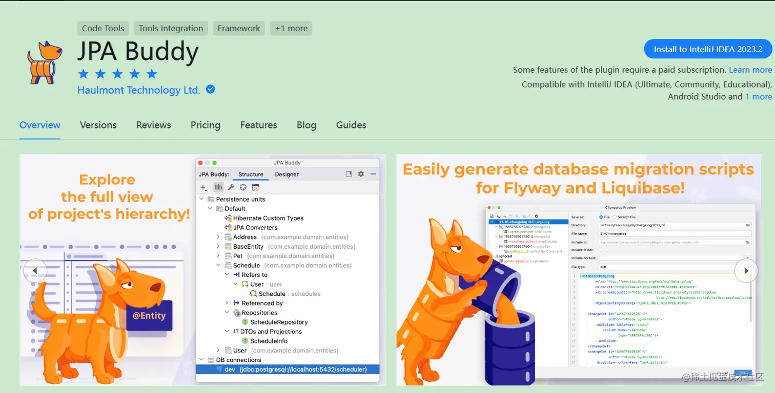 JPA Buddy是一个广泛使用的IntelliJ IDEA插件,面向使用JPA数据模型和相关技术(如Spring DataJPA,DB版本控制工具(Flyway,Liquibase),MapStruct等)的新手和有经验的开发人员。该插件提供了可视化设计器、代码生成和其他检查,这些检查应根据 JPA 的最佳实践简化开发并改进代码。