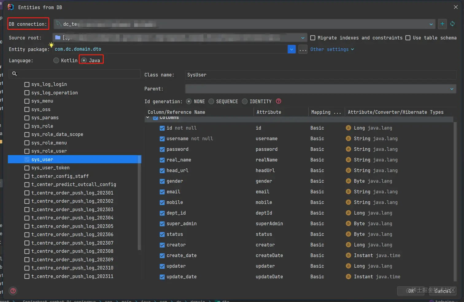 数据库表生成实体