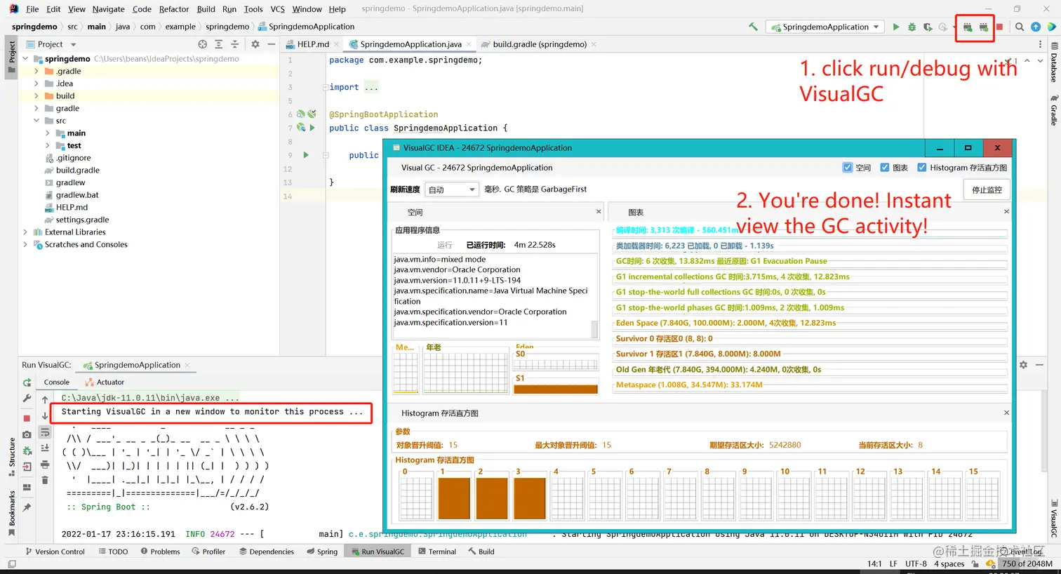如果需要不依赖IDEA单独运行, 请移步: VisualGC 3.0 独立运行增强版, 支持JDK 8
